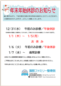 下記日程を当院の年末年始の休診日とさせていただきます。